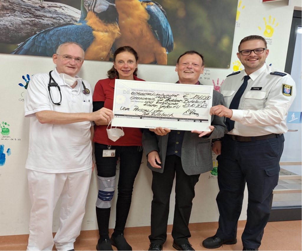 So konnte stolz vor der Kinderkrebsstation Peiper des Universitätsklinikums Gießen-Marburg die Geldspende an den Elternverein für leukämie- und krebskranke Kinder Gießen, vertreten durch die Erzieherin Corinna Altinkilic, im Beisein von Professor Dr. Dieter Körholz durch den Anstaltsleiter Uwe Röhrig und dem Personalratsvorsitzenden Kristof Petring übergeben werden.