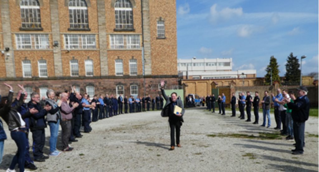 In der JVA Butzbach wurde er anlässlich seines letzten Arbeitstages im aktiven Dienst vor der Ruhestandsversetzung am Donnerstag, den 21.03.24 feierlich verabschiedet. Die Bediensteten stellten sich im Vorhof und Lazaretthof in Reihen auf für seinen Weg in die Turnhalle zu seiner letzten großen Dienstbesprechung.