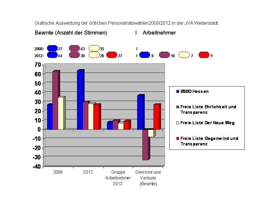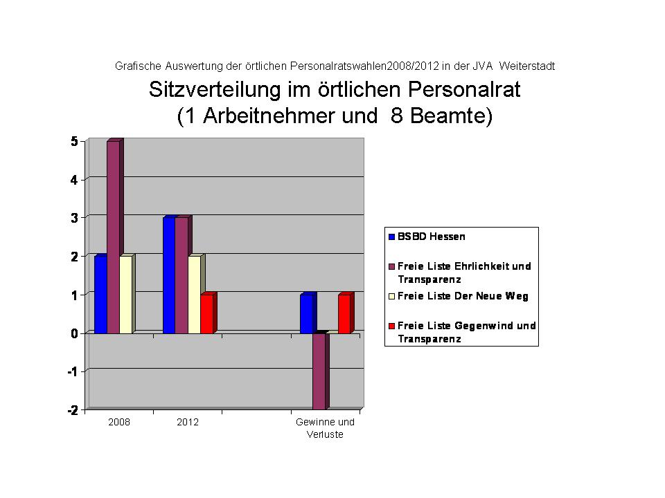 Der Personalrat wurde am 06. Mai 2008 gewählt. Die konstituierende Sitzung fand am Freitag, 09. Mai 2008 statt. Bei dieser Sitzung wurde als Personalratsvorsitzender Jürgen Gesell gewählt; seit 03.11.2010 ist dies Kollege Jörg Laux (Liste 2), da Kollege Gesell zum 01.11.2010 an die JVA Frankfurt I versetzt wurde. Als stellvertretender Vorsitzender wurde am 09.05.2008 Harry Falk gewählt, der bis zur Neuwahl des Personalratsvorsitzenden am 03. November 2010 die Geschäftsführung als stellvertretender Vorsitzender übernommen hatte. Harry Falk stand auch für die Wahl des Vorsitzenden zur Verfügung, u.a. mit der Begründung, dass die 100%ige Freistellung nur von einer Stelle des AVD gewährleistet werden kann. Der erst am 03. November 2010 gewählte Personalratsvorsitzende hat am 29. Dezember 2010 seinen Rücktritt von diesem Amt bekannt gegeben (kein Austritt aus dem Personalrat). Der im Jahr 2008 gewählte Personalrat wird setzt sich wie bisher auch aus 9 Mitgliedern zusammen. Dabei fallen 8 Sitze an die Beamten (davon 6 Sitze an die Männer und 2 Sitze an die Frauen) und 1 Sitz an die Arbeitnehmer (bei der letzten Personalratswahl je 1 Sitz an Angestellte und Arbeiter), wobei dieser eine Sitz an die Frauen zu vergeben ist.