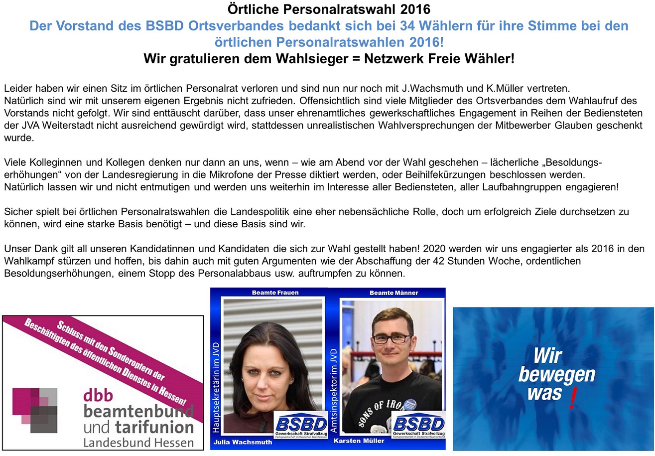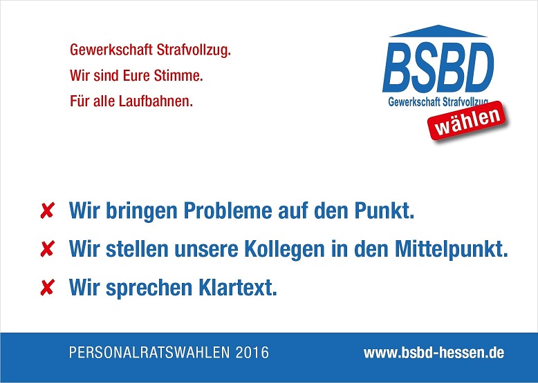 Weiterstadt, 24.05.2012 Danke! Liebe Kolleginnen und Kollegen, Die Kandidatinnen und Kandidaten des BSBD Ortsverbandes Weiterstadt bedanken sich ganz herzlich bei allen Wählerinnen und Wählern für das entgegengebrachte Vertrauen! Der BSBD Hessen ist und bleibt im Hauptpersonalrat für den Justizvollzug die Nummer 1 und es ist uns mit Eurer Hilfe gelungen, auch im örtlichen Personalrat die Nummer 1 zu werden. Wir sind in Zukunft mit Julia Wachsmuth, Harry Falk und Karsten Müller im örtlichen Personalrat vertreten. Wir werden versuchen den Vorsitz im örtlichen Personalrat zu behalten, da wir das Ergebnis (Wählerstimmen mehr als verdoppelt) als Bestätigung unserer Arbeit im Personalrat der letzten 4 Jahre sehen. Natürlich ist diese Arbeit noch ausbaufähig. Die hohe Wahlbeteiligung am 23.05. war dem Gedenktag zur Verkündung des Grundgesetzes der Bundesrepublik Deutschland (1949) würdig. Wir gratulieren auch unseren Konkurrenten und hoffen auf eine konstruktive, zielorientierte Zusammenarbeit. Im Namen der Kandidatinnen und Kandidaten des BSBD Ortsverbandes Weiterstadt.